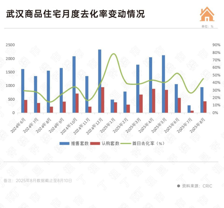 据CRIC监测,2025年8月前10日武汉推盘套数940套,而7月全月推盘套数仅276套;从项目平均去化率来看,8月前10日稳中有增至45%,较7月全月26%增长19个百分点。