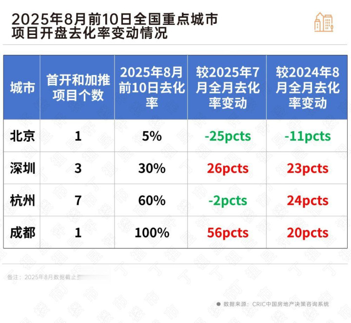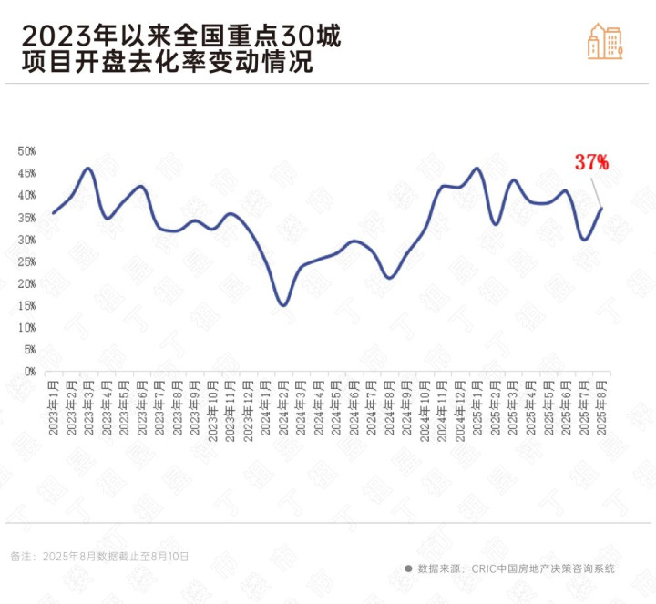 从短期市场热度来看,据CRIC监测数据,8月上旬重点30城项目开盘去化率为37%,较2025年7月全月微增7个百分点,与2024年8月全月相比增长16个百分点。