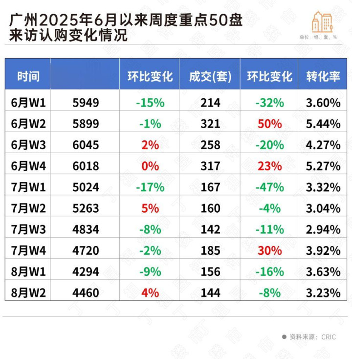 8月以来,项目周来访量基本持稳在5500组,认购量则是保持在300组。CRIC监测的重点项目显示,第32周来访量环比微涨1%,认购量环比上涨18%,转化率环比持平,整体市场热度延续低位波动趋势。