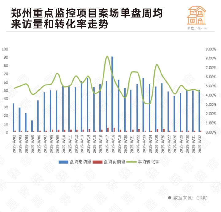 还有郑州。CRIC重点监测,郑州第32周盘均来访量为51组,而盘均认购套数仅为2套,客户转化率维持4.4%低位波动。